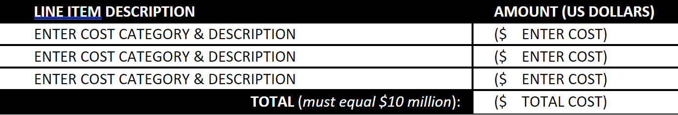 Provide specific line items from the budget narrative (above) for your work. To help us understand your priorities, please provide a detailed budget for how the $10 million (USD) grant would be spent. Please make sure that any funds identified in this table reflect and clarify your general explanations provided in the budget narrative above. Budget should follow these guidelines or risk ineligibility: